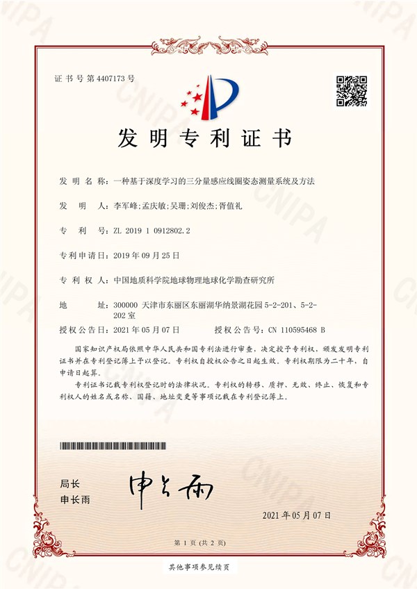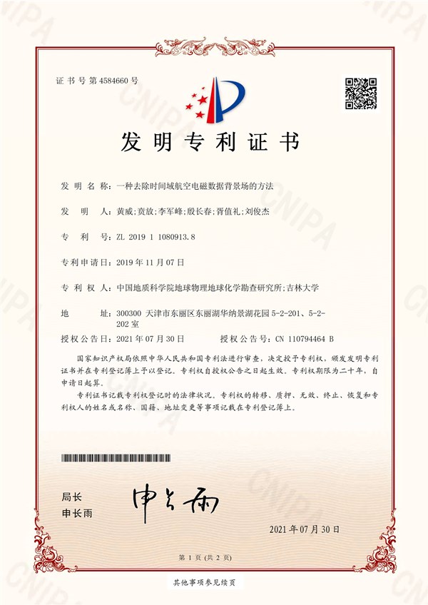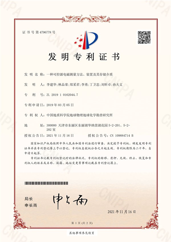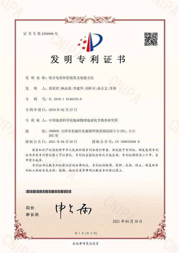 2021年度,依托国家重点研发计划、国家自然科学基金、地质调查专项、中央级公益性科研院所基本科研业务费等项目,自然资源部中国地质调查局地球物理地球化学勘查研究所在地质理论创新、勘查技术进步和仪器设备研发等方面取得突破性进展,获国家知识产权局授权国家专利43项,包括组合电容补偿装置及连接方法等国家发明专利6项、地震数据采集系统等实用新型专利37项。