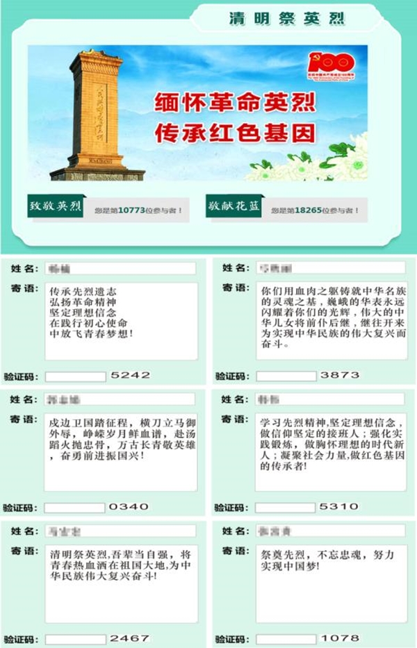 此次网上祭奠活动,让广大青年干部职工接受了一次革命英烈的精神洗礼,激发了大家牢记初心使命、勇于担当作为的热情。篇篇寄语里,大家纷纷表示要继承先烈遗志,发扬革命精神,进一步坚定理想信念,赓续共产党人精神血脉。在中国共产党成立100周年之际,在实施“十四五”规划、开启全面建设社会主义现代化国家新征程、向第二个百年奋斗目标进军的开局之年,在加快物化探事业转型升级、实现高质量发展的关键之年, 要准确把握新发展阶段,深入贯彻新发展理念,胸怀感恩之心、崇敬之情,进一步提高积极性、主动性和创造性,积极做到守正创新抓机遇,锐意进取辟新局,为所的和谐、稳定、转型发展积极贡献青春力量。