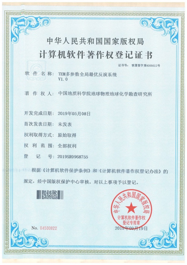 “TEM多参数全局最优反演系统V1.0”。此软件通过引入Cole-Cole模型实现了含激电效应的瞬变电磁正演,联用遗传算法和粒子群算法实现了带激电效应的瞬变电磁反演,同时获取地下介质的电阻率和极化率参数,有效解决辽东地区含石墨、黄铁矿化等高极化地层瞬变电磁畸变数据的正反演处理解释问题。