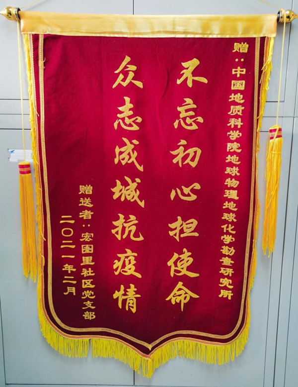 2021年2月8日,物化探所辖区宏图里社区居委会、党支部主要负责人带队,专程到物化探所赠送锦旗和荣誉证书,充分肯定了物化探所疫情防控的工作成效,高度评价了广大志愿者和楼门长主动投身社区疫情防控斗争中展示出来的大局意识和担当精神,并对物化探所给予社区新冠肺炎疫情防控工作的大力支持和帮助,对广大志愿者和楼门长的辛勤付出和无私奉献表示感谢。