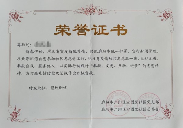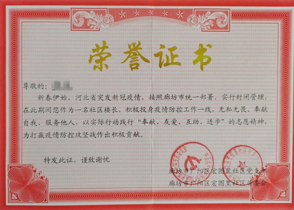 宏图里社区居委会为社区楼长赠送荣誉证书