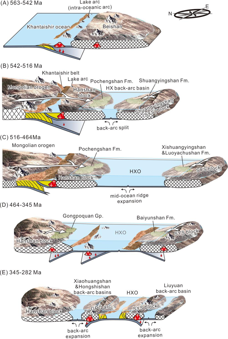 (1)红柳河-洗肠井洋在埃迪卡拉纪尚未形成,形成的原因可能是蒙古造山带南部的Khantaishir洋的南向俯冲,其演化经历了弧后裂解(ca. 542–527 Ma)、弧后盆地形成及扩张(ca. 526–470 Ma)和双向俯冲(ca. 470–285 Ma)3个阶段。该洋盆两侧在中-晚奥陶世均转变为活动大陆边缘。