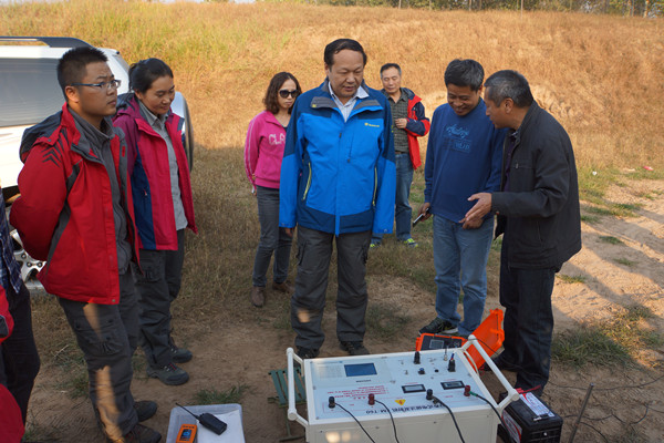 在永清县韩村镇检查了使用我所自主研发的大功率多功能电法仪开展的针对第四系结构和活动断裂确定的电法测量工作,检查组详细了解了供电、发射、接收测量仪器状态,测区干扰、收发系统的布设以及测量结果对地质结构的反映情况。