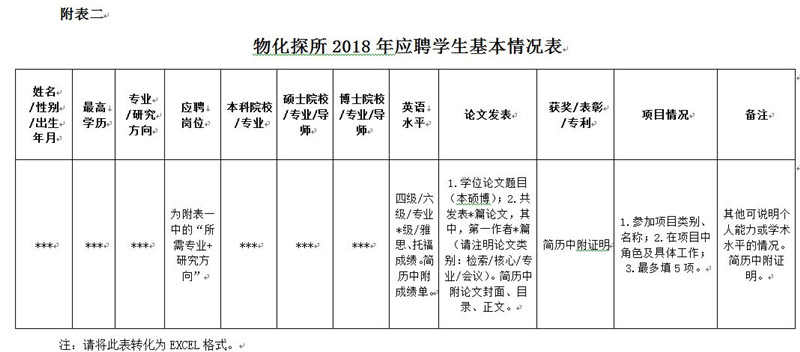 2、提交资料:本人电子版简历。必须包括联系方式、所学专业及本、硕、博期间专业课程成绩、英语成绩和科研工作、学术论文发表情况,本、硕、博论文研究方向和相关研究成果、获奖情况,最高学历以前各阶段毕业证书和学位证书复印件。《2018年应聘学生基本情况表》(附表二)。请按表中要求认真填写,凡不提供基本情况表的应聘人员,视为无效简历。