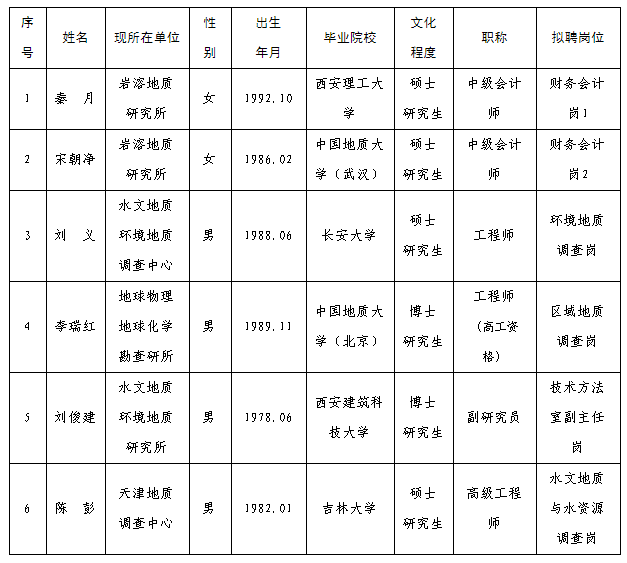 根据中国地质调查局双向交流选调工作安排,经发布公告、报名、资格审查、面试、考察、体检等程序,中心党委集体研究确定交流选调拟聘用人员,现予以公示。
