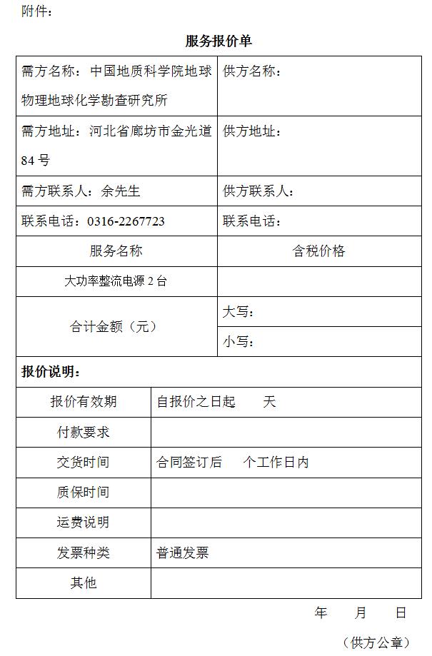 报价方式:将报价单原件(报价单格式见附件)、相关资质证明复印件1份(包括但不限于营业执照)加盖公章,报价文件密封后邮寄到中国地质科学院地球物理地球化学勘查研究所装备处。逾期送达或不符合报价规定的恕不接受。