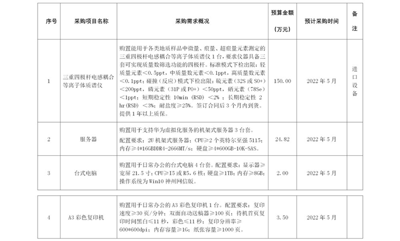 为便于供应商及时了解政府采购信息,根据《财政部关于开展政府采购意向公开工作的通知》(财库〔2020〕10号)等有关规定,现将中国地质科学院地球物理地球化学勘查研究所2022年5月采购意向公开如下: