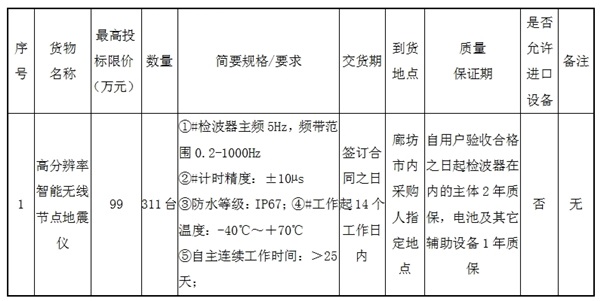 项目名称:高分辨率智能无线节点地震仪设备采购项目