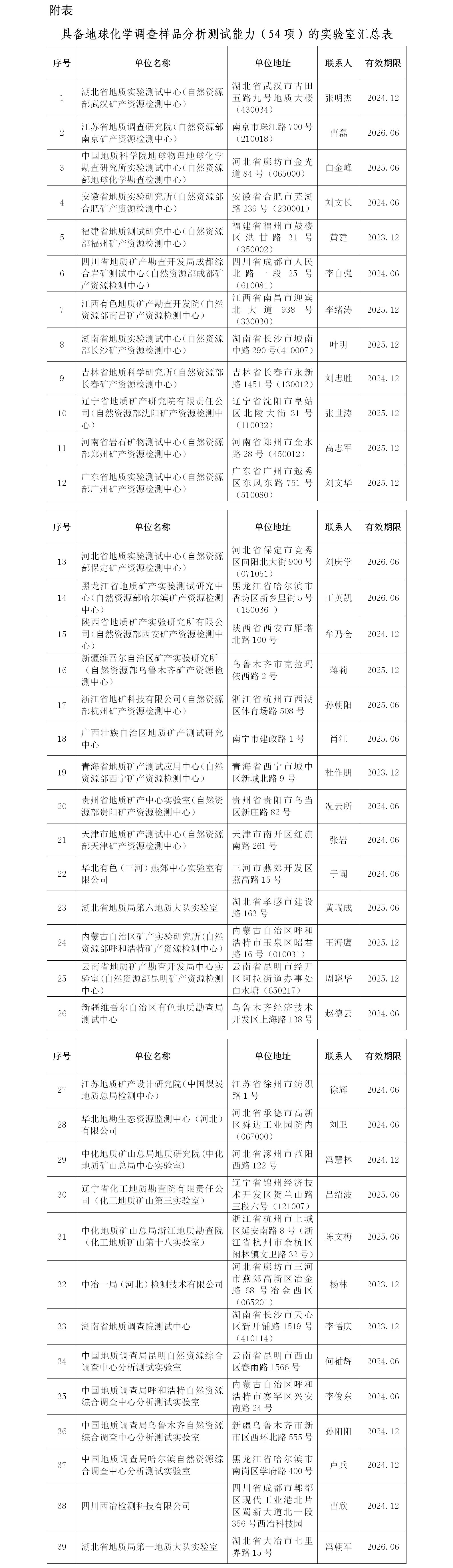 目前,全国共有39家实验室具备地球化学调查项目样品测试能力(54项),详见附表。