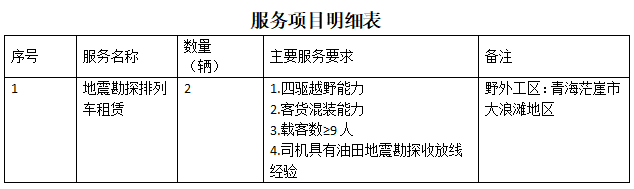 租赁2台地震放线专用排列车(每辆车配备1名司机,共计配备2名司机)在青海省茫崖市大浪滩地区开展二维反射地震勘探,预计施工时间为2024年6月-9月,总租期≤90天,采购人负责出发地至工区的过路费和使用期间的油费、过路费。