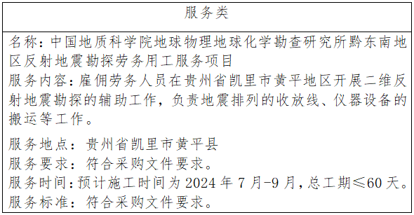 二、项目名称:中国地质科学院地球物理地球化学勘查研究所黔东南地区反射地震勘探劳务用工服务项目
