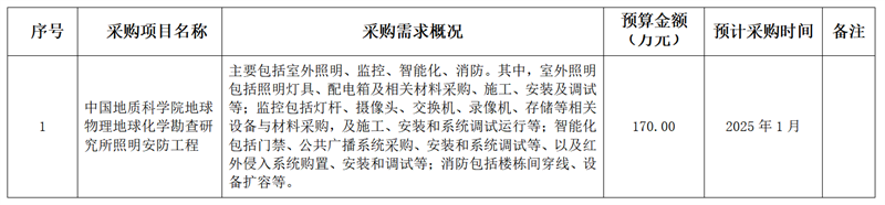 为便于供应商及时了解政府采购信息,根据《财政部关于开展政府采购意向公开工作的通知》(财库〔2020〕10号)等有关规定,现将中国地质科学院地球物理地球化学勘查研究所2025年1月政府采购意向公开如下: