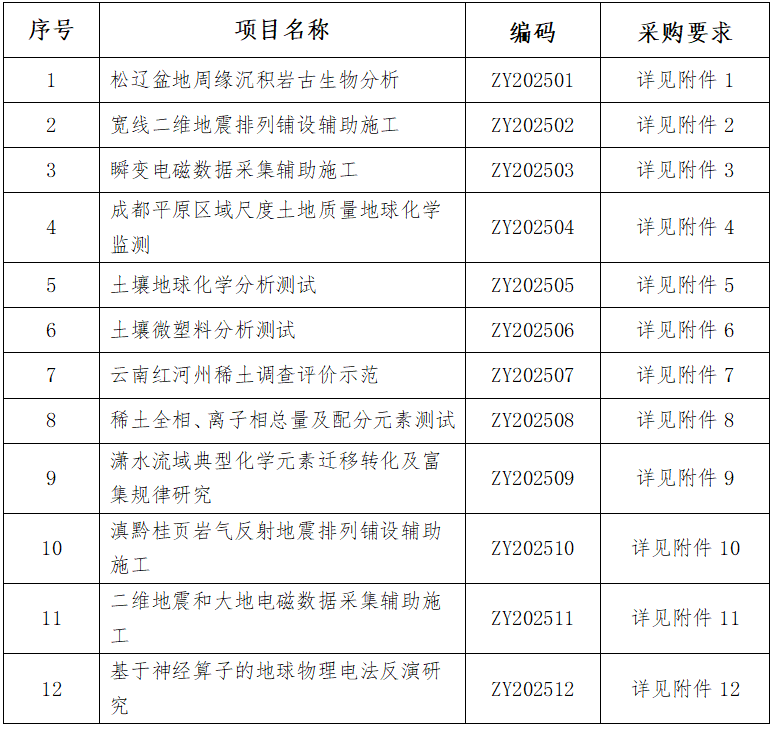 物化探所2025年度地质调查项目外协工作(择优选择)共12项,具体如下: