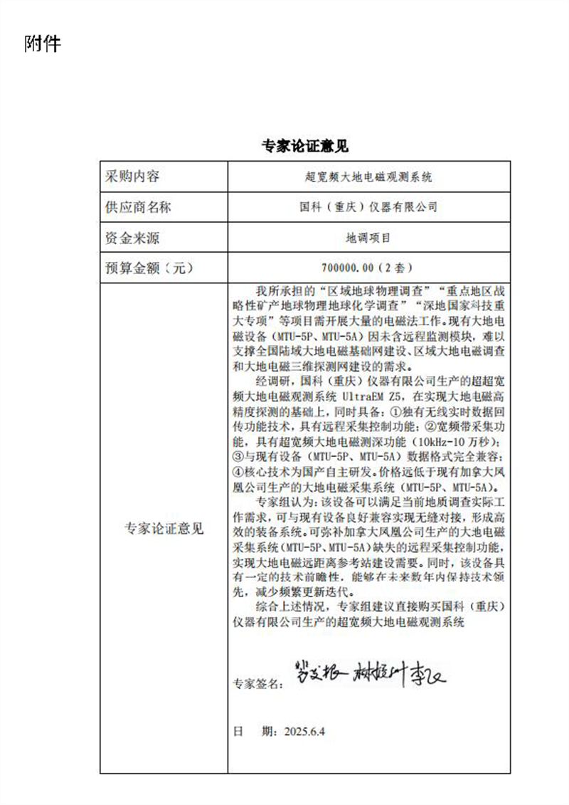 中国地质科学院地球物理地球化学勘查研究所超宽频大地电磁观测系统采购项目,经组织所内专家论证,超宽频大地电磁观测系统UltraEM Z5可弥补我所现有加拿大凤凰公司生产的大地电磁采集系统(MTU-5P、MTU-5A)缺失的远程采集控制功能,可实现大地电磁场实时、远程监测需求。同时,该设备具有一定的技术前瞻性,能够在未来数年内保持技术领先,减少频繁更新迭代。项目预算金额70.00万元(人民币),该项目拟由唯一供应商:国科(重庆)仪器有限公司提供产品。现将有关情况向潜在供应商征求意见。征求意见期限从2025年6月6日至2025年6月12日止。