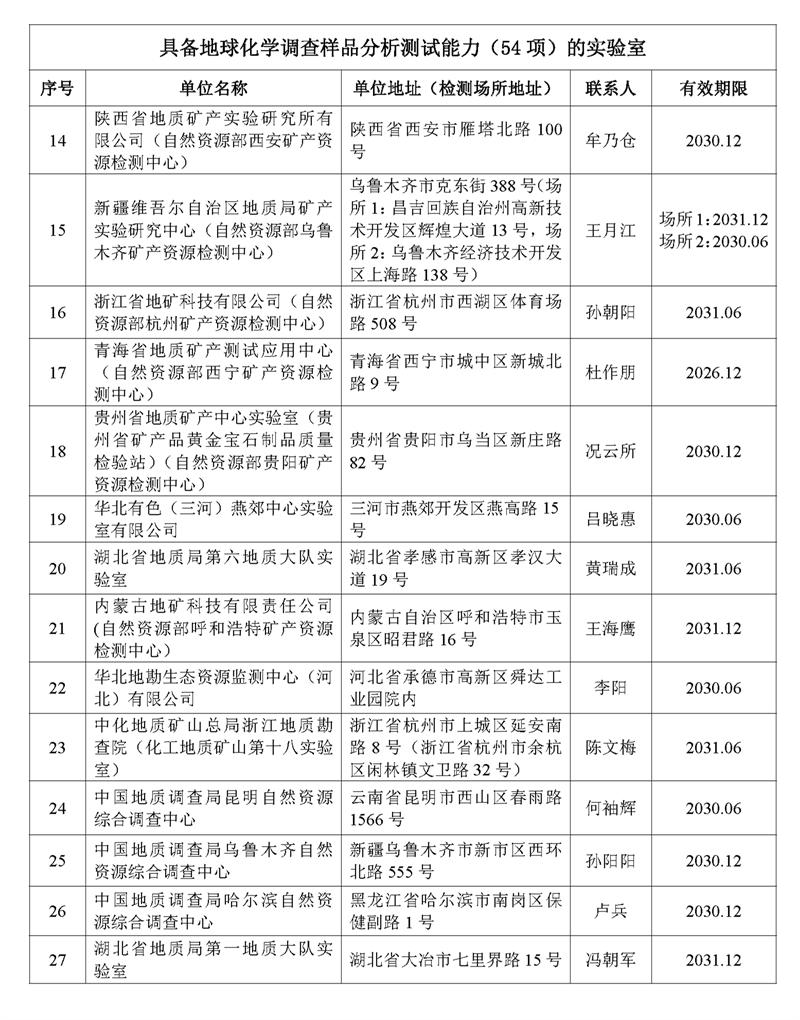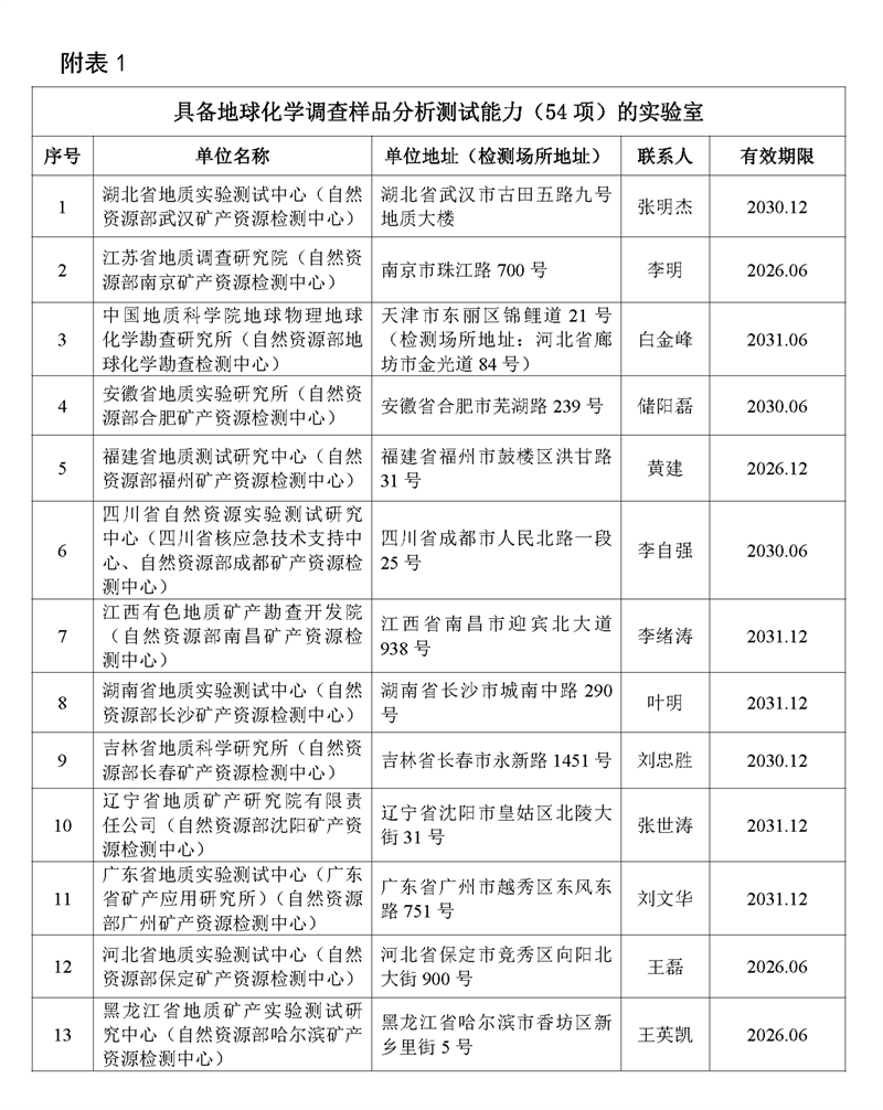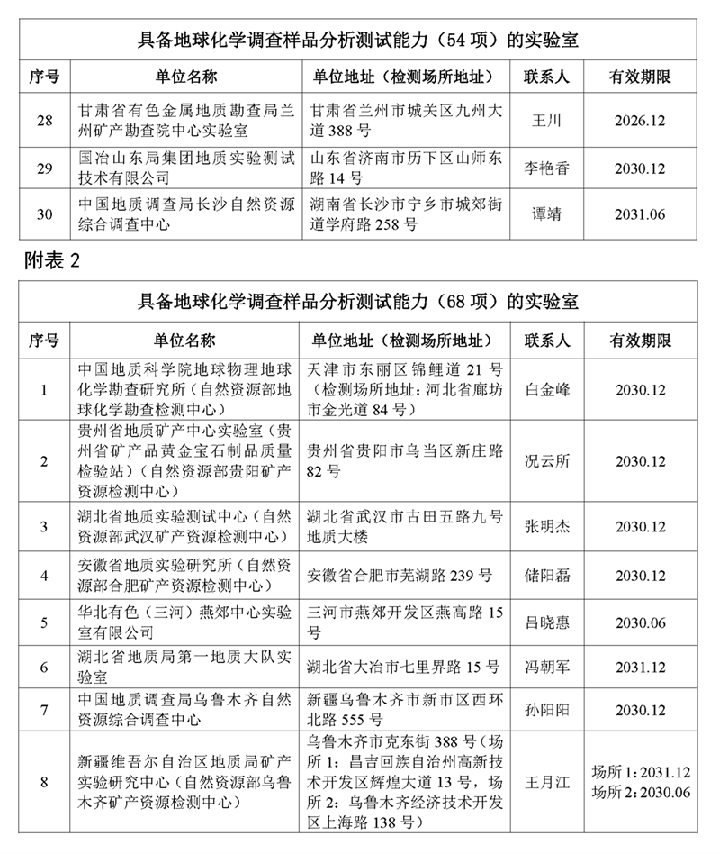 目前,全国共计30家实验室具备54项地球化学调查项目样品测试能力、8家实验室具备68项地球化学调查项目样品测试能力,详见附表1和附表2。